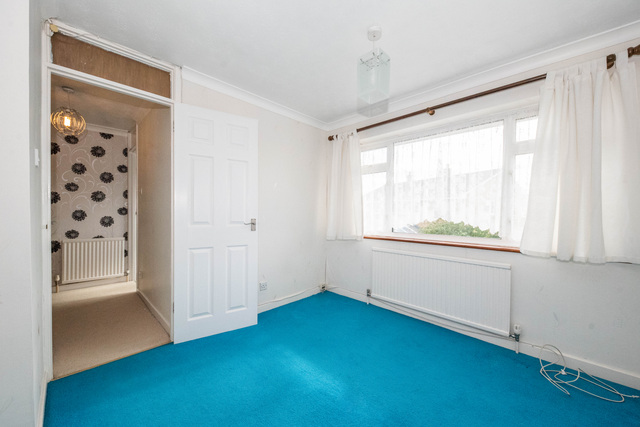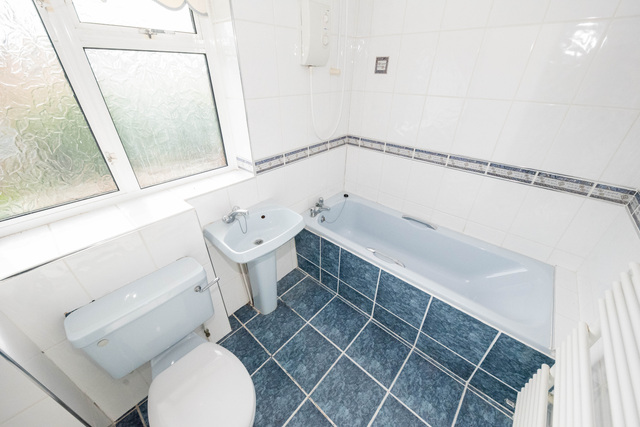 Upstairs, there are two double bedrooms and one good-sized single bedroom. The main bedroom benefits from extensive built-in wardrobe space. The bathroom is functional, fitted with a low-flush toilet, pedestal basin, and panelled bath.